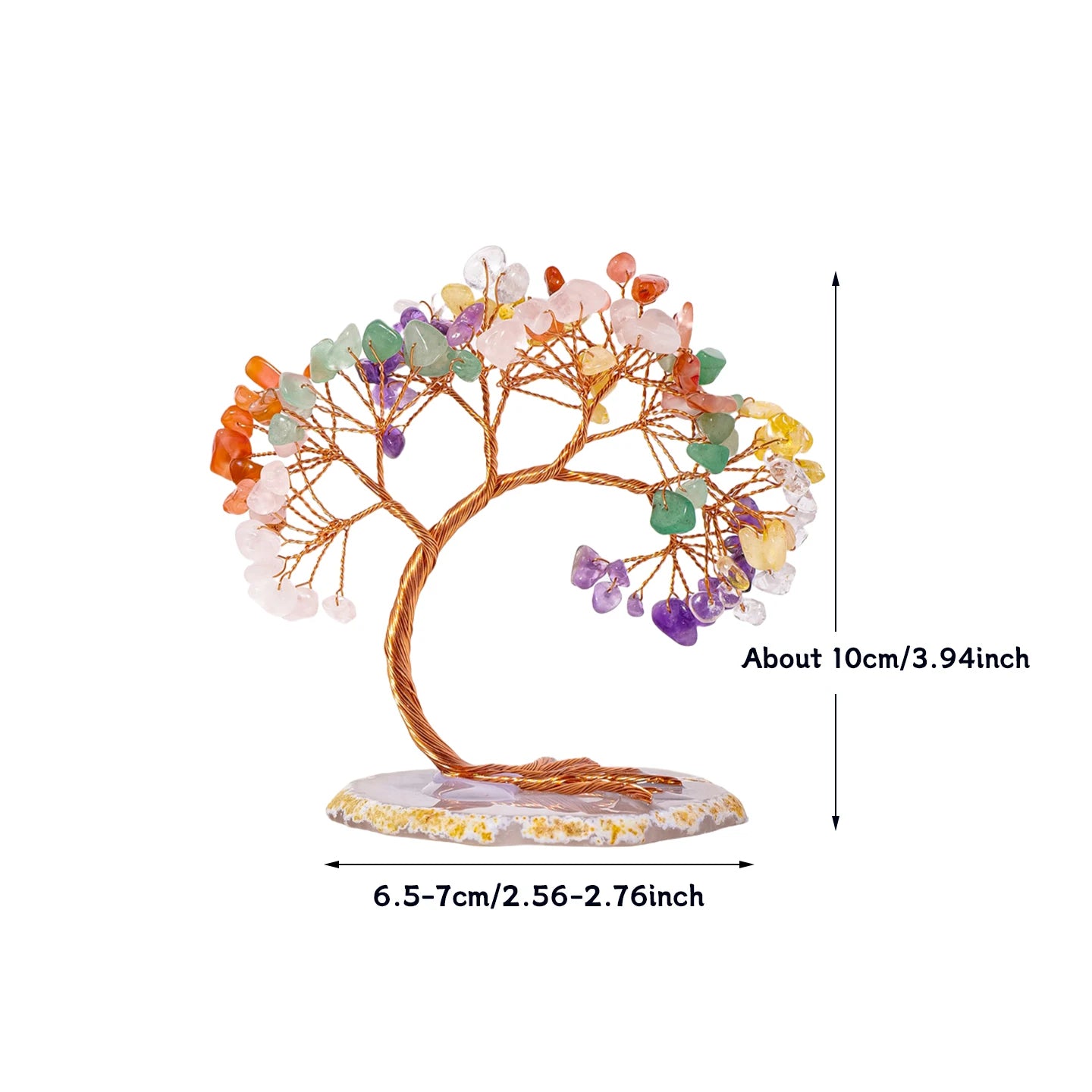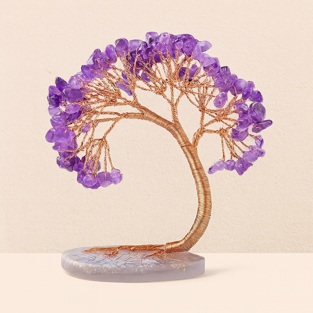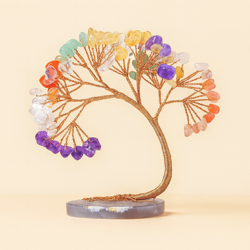 Chaque arbre est confectionné à la main, rendant chaque pièce unique. Le tronc solide, souvent réalisé en fil métallique torsadé, symbolise la stabilité, tandis que les branches libres et souples rappellent l'ouverture aux opportunités et aux changements. Les pierres, telles des fruits éclatants, captent la lumière et diffusent une énergie douce et bienfaisante.